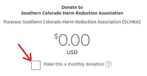 The following donation amounts are suggested in an effort to simplify the donation process for our amazing patrons. Any donation amount is greatly appreciated and accepted as an effort to support the services Southern Colorado Harm Reduction Association (SCHRA) provides to our clients as well as grow awareness and education through our community outreach, the Pueblo Addiction Community Coalition (PACC).